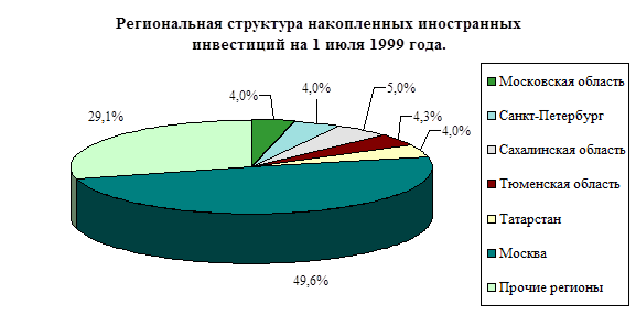 Экономическое развитие российских регионов характеризуется углублением межрегиональных контрастов и продолжающейся концентрацией деятельности иностранных инвесторов в ограниченном числе наиболее динамично развивающихся и стабильных субъектов Российской Федерации. На региональной структуре иностранных инвестиций сказалось их преимущественное привлечение в предприятия ТЭК. Устойчиво сохраняется значимость Москвы, а также Санкт-Петербурга и Московской области как центров деловой активности. Третьим центром притяжения являются приграничные области, такие как Калининградская область, Приморский край.