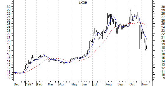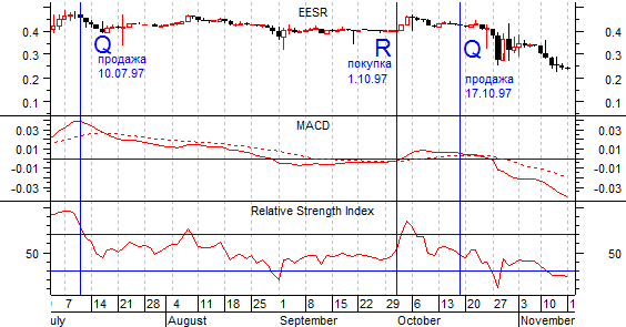 До 15 августа цена акций возрастала, после чего наступила коррекция цен рынком. 4 сентября 1997 г. после пересечения средних скользящих акции были проданы по цене 23,87 на общую сумму 119 350 $. В данном случае продажа акций осуществилась не в лучший момент времени, а когда рынок падал уже полмесяца. Акции в такой момент не продавались в надежде на быстрое восстановление цен, которое не оправдалось.