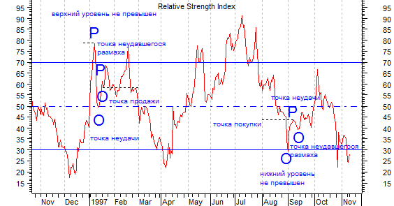 Индекс относительной силы откладывают на шкале от 0 до 100. Лучше всего он работает, достигая области экстремумов. Критерием оценки служат две линии, проведённые на уровне 30 и 70. Выше 70 находится зона перекупленности, а ниже 30 - перепроданности. Поэтому, когда значение индекса относительной силы достигает и поднимается выше 70, возникает угроза спада цен; движение ниже 30 воспринимается как предупреждение о близком подъёме. Некоторые аналитики советуют принимать в качестве границ уровни 30 и 70 только при боковых трендах, а 20 и 80 - при ярко выраженных бычьем и медвежьем (рис. 12).