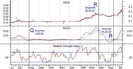 Покупка акций была проведена в момент, когда осциллятор Relative Strength Index находился в середине области. Рынок акций РАО “ЕЭС России” находился в стабильном состоянии, когда цена акций практически не менялась, до 27 декабря 1996 г., после чего цена акций стала медленно увеличиваться. В то же время осциллятор Relative Strength Index указывал на высокую перепроданность, а 12 и 26 дневные средние скользящие - устойчивый рост. Было принято решение не продавать акции.