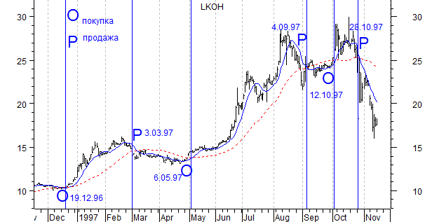 19 декабря 1997 г. на рынке куплено 5000 акций по цене 10,45 $ на общую сумму 52 250 $ в точке пересечения 10 дневной средней скользящей и 40 дневной средней скользящей.