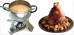 1. изображение национальных блюд: фондю (Австрия), свиная рулька (Швейцария).