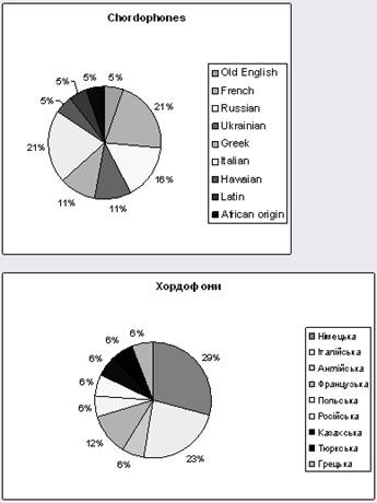 5. When we have analyzed native lexical elements in English and Ukrainian, we saw that it is represented by insignificant quantity in both languages. In Ukrainian native element is represented by the larger quantity of elements which can be explained by the fact that the words were taken from the standart classification and there were no national English instruments and there were some Ukrainian. That is why we do not pay much attention to these results.
