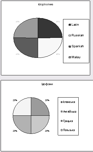4. We can say that the common feature between the two languages is that the classical element (Greek and Latin) is represented both in English and in Ukrainian when comparing them. This fact is connected with the historical development of all the Indo-European languages. Italian, French and German elements are represented in both languages too, which is connected with specific features of borrowing of words denoting cultural elements. We can see that German element is represented by the greater quantity in Ukrainian than in English (3 elements in English and 10 in Ukrainian), and so is the Russian (5 elements in English and 6 in Ukrainian). Polish element is represented in Ukrainian while in English it isn’t. The French element is represented by the greater number of units in English than in Ukrainian (11 units in English and 3 in Ukrainian). The reason is specific features of cultural, social and political connections of the two countries.