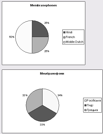 3. German, Italian and Russian elements are the most numerous in Ukrainian. The German is represented in Aerophones and Chordophones (5 and 5 words). Russian is represented in Aerophones, Chodophones and Membranophones (4, 1 and 1 word). Italian element is represented in Aerophones and Chordophones (2 and 4 elements accordingly). Polish (3 words), English (3 words) and French (3 words elements) are numerous too.