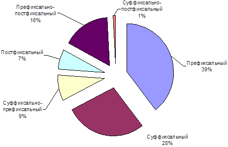 Разные виды аффиксации имеют различную продуктивность в образовании частей речи: имена существительные и прилагательные чаще образуются посредством суффиксов, а глаголы - посредством префиксов; суффиксально-префиксальный способ словообразования более продуктивен в области глаголов и менее продуктивен в области имен.