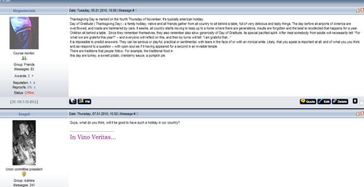 Таким образом, форум веб-сайта учебной группы, предоставляющих возможность для тематических дискуссий на английском языке, является средством для выполнения некоторых учебных задач лингво-культурного характера.