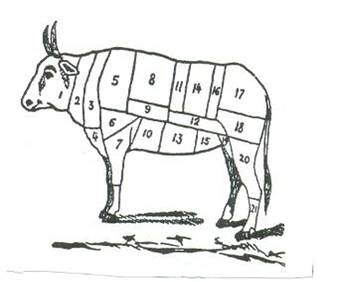 ГUВЯДО ср. ирк. крупная рогатая скотина, бык, вол или корова. Говяжий, от быка, говяда взятый, из мяса его приспетый. Говядипа Ж. говяжье мясо. Части говядины, у мясников, называются: 1) толова, 2) шея, зарез, 3) оковалок, 4) челышко, 5) толстый край, 6) средина лопатки, 7) тонкая лопатка, рулька, 8) тонкий край, 9) от края покромка, 10) грудина, 11) тонкий филей, 12) подпашек, 13) завиток, 14) толстый филей, 15) бочок, 16) английский филей, 17) огузок, 18) средина бедра, 19) кострец, 20) ссек, подбедерок; окосток, часть ссека, с вертлюжн. костью, 21) голяшка. Зачисток, от краев, от шеи, тонкие остатки, оборыши. Голяшки и морда, студень. Легкие, сердце и печень, гусак, ливер, осердье. Желудок с кишками, требуха, требушипа. у мясников иностранных roвядина делится иначе. Были бы быки, а говядина будет. По барыне говядина, по харчевпе едок. Говядарь, гуртовщик, прогонщик, нагульщик скота и скотопромышленник.