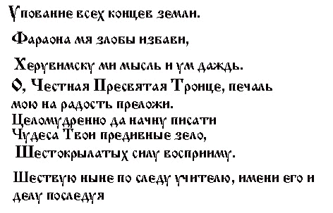 «A3 СЛОВОМ СИМ МОЛЮСЯ БОГУ» (обнаружена среди рукописей бывшей Патриаршей библиотеки в сборнике, принадлежавшем когда-то патриарху Никону): В данном издании молитва приводится в сочетании с изображением соответствующих букв славянской азбуки и их названиями. Сам текст молитвы передается привычными нам буквами русского алфавита с сохранением звучания текста оригинала (Приложение 4).