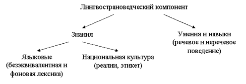 Лингвострановедческий компонент лингвострановедческой компетенции включает в себя определенные знания (языковые и культурологические), а также навыки и умения (речевого и неречевого поведения). Лингвострановедческий материал включает безэквивалентную лексику, обозначающую национальные реалии, фоновую лексику, коннотативную лексику. [17] Постоянным признаком принадлежности материала к лингвострановедческому является наличие у него национально-культурного компонента
