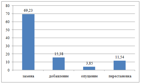 Как видно из данной диаграммы, самым распространенным видом переводческих трансформаций, используемых при переводе научно-технических текстов. Является трансформация путем замены. На втором месте по частоте использования трансформация добавления. На третьем месте трансформация перестановкой. И на четвертом месте трансформация методом опущения, которая встречается крайне редко.