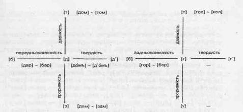 Хоча фонема — найменша сегментно (лінійно) неподільна мовна одиниця, однак вона є складним явищем: має багато ознак. Ознаки бувають диференційні (розрізнювальні) й інтегральні (нерозрізнювальні). [4, с. 78-79] Пояснимо це на прикладі російських приголосних [д] і [г] (див. схему 1). Фонеми російської мови <д> і <г> мають по чотири ознаки. Для першої фонеми — це передньоязико-вість, дзвінкість, твердість і проривність, для другої — задньоязиковість, дзвінкість, твердість і проривність. Якщо у першому випадку всі ознаки використовуються для протиставлення іншим фонемам (передньоязиковість <д> протиставляється губності <б> (дар — бар), дзвінка <д> має парну глуху <т> (дом — том), твердість <д> протиставляється м'якості <д*> (дома — Ц'ема [д'омт,]), а проривність — фрикативним, африкатам тощо (дам — зам), то в другому випадку для протиставлення іншим фонемам використовується лише дві ознаки — задньоязиковість (гор — бор) і дзвінкість (гол — кол). Усі перелічені тут ознаки фонем <д> і <г> є диференційними, бо саме за цими ознаками фонеми <д> і <г> протистав ляються відповідно фонемам <б>, <т>, <д'>, <з>, і <б> та <к>.