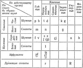 Примечание 1. Звук [ʒ] стоит в таблице в скобках, так как он встречается только в заимствованных словах и не может быть, поэтому быть причислен к системе фонем немецкого языка без оговорок.