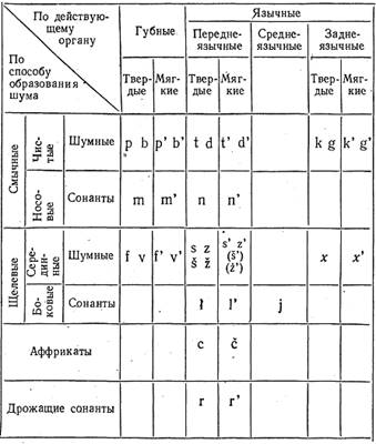 Русская система согласных насчитывает 34 согласные фонемы: [п п’, б б’, м м’, aa’, в в’, т т’, д д’, с с’, з з’, л л’, н н’, р р’, ч, к, г, х, ц, ш ш:, ж:, й]. 12 пар согласных различаются по твердости/мягкости, образуя 24 самостоятельные фонемы, например: