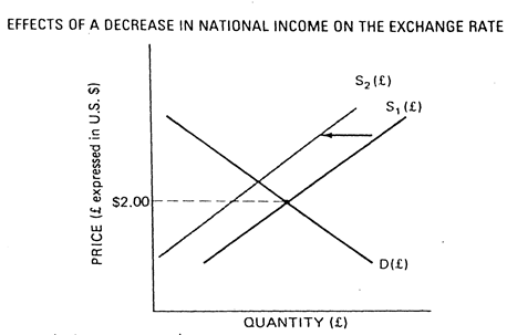 shows the effects of a decline in national income in Britain (assuming all other factors remain constant). The decrease in British income implies a decrease in demand for goods and services (both domestic and foreign) by British people. This reduction in demand for imported goods leads to a reduction in the supply of pounds, which is shown by a leftward shift of the supply curve in Figure 2 (from S