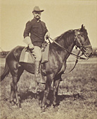 After his return from the war in Cuba, Colonel Roosevelt posed for this photograph at Montauk, Long Island, shortly before his First Volunteer Cavalry Regiment was mustered out of service in September 1898. Later, in a letter to sculptor James E. Kelly—who like Frederick MacMonnies sculpted a statuette of the Rough Rider upon a horse—Roosevelt described in detail how he looked and dressed in the war. Unlike his image here, he said, "In Cuba I did not have the side of my hat turned up."