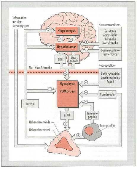 Die Abb. 1 (unten) stellt den Schaltplan dar, wie das Gehirn auf Stress reagiert. Signale aus der Umwelt werden nach der Reizverarbeitung und Verwertung im Gehirn, besonders im Hippokampus, anschließend im Hypothalamus in chemische Aktivität verwandelt. Der Corticotropin-releasing-Faktor (CRH) und Vasopressin werden vom Hvpothalamus freigesetzt. Es handelt sich um Neuropeptide, welche die Produktion von ACTH veranlassen. Dieses wiederum stimuliert die Bildung von Kortisol, einem Stresshormon. Es hemmt in einer Rückkopplungsschleife die weitere Freisetzung von CRH und ACTH. Viele Neurotransmitter und andere Neuropeptide wirken auf verschiedenen Wegen regulierend. lmntunopeptide sind dabei von besonderer Bedeutung. Kortisol kann die Rezeptoren für Serotonin und Noradrenalin ebenso verändern (erhöhen) wie die Produktionsgroße dieser Neurotransmitter.