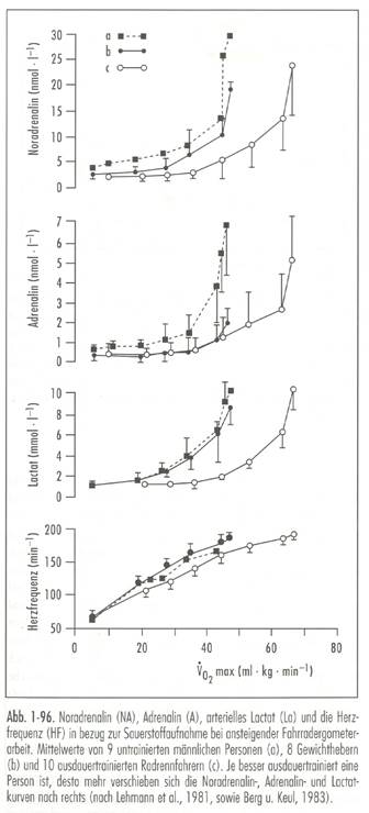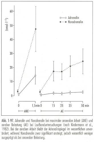 Es bestehen enge Beziehungen zwischen dem belastungsbedingten Anstieg des Lactatspiegels im arteriellen Blut und der Zunahme von Noradrenalin und Adrenalin. Der belastungsbedingte Anstieg des Noradrenalins entstammt vermutlich dem Skelettmuskel. Bei intensiver Arbeit kleiner Muskelgruppen mit entsprechend geringer maximaler Sauerstoffaufnahme steigen die Katecholamine höher an als bei der Arbeit mit großen Muskelgruppen mit hoher maximaler 02 -Aufnahme. Der Plasma- Adrenalinaufstieg ist in Relation zu dem des Noradrenalin bei statischer Arbeit stärker als bei dynamischer. Bei konstanter Größe der Sauerstoffaufnahme steigen Noradrenalin und besonders Adrenalin bis zum Zeitpunkt der Erschöpfung an. Auch bei Hypoxie nimmt auf gegebenen Belastungsstufen und damit unveränderter Größe der Sauerstoffaufnahme der Katecholaminspiegel stärker zu als unter Normalverhältnissen. Umgekehrt bewirkt Hyperoxie eine geringe Reduzierung des Katecholaminspiegels.