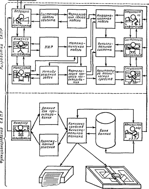 Как видно из рассмотрения представленной на рис. 1 схемы, разработка процесса автоматизированного проектирования требует тесного сотрудничества ученых и инженеров разных специальностей — конструкторов, математиков, специалистов по автоматизированной обработке информации, программистов, электронщиков и организаторов производства (рис. 2).