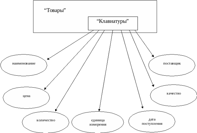 Пример: объект “клавиатуры” входит в состав объектного множества “товары” и обладает следующими атрибутами: наименование (клавиатуры), цена за единицу товара (150 р), количество единиц товара (3), единица измерения товара (штука), дата поступления (01.04.2001), качество товара (среднее), поставщик (Тайвань).