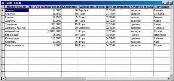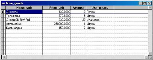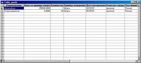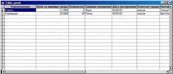 На основании диаграммы и словаря данных составим структуру базы данных “Goods”. Поскольку на диаграмме изображено только одно объектное множество, то, следовательно, в базу данных будет входить только одна реляционная таблица. Перечислим и дадим названия полям таблицы “Table_Goods” в соответствии с диаграммой: