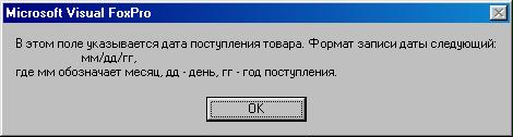 Дата поступления. Хранит число, месяц и год поступления товара. Тип данных – выражение даты (Date). Ширина поля – 8 символов. Возможные значения записываются в формате: мм/дд/гггг, где мм – номер месяца (01..12), дд – день (01..31), гггг – номер года.