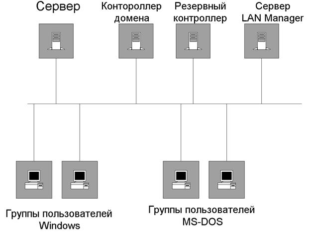 , а также компьютеры, служащие в качестве стандартных серверов, серверов LAN Manager 2.x, клиентов Windows NT Workstation и других клиентов, как например, работающих с MS-DOS(рис.1.4).