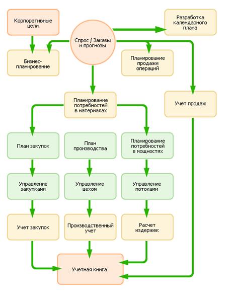 1) Планирование продаж и производства. Управление спросом. 2) Планирование потребностей в материалах. 3) Спецификация изделий. 4) Планирование потребностей в мощностях. 5) Проверка и корректировка цеховых планов по мощностям. 6) Управление закупками, запасами, продажами. 7) Управление финансами. 8) Управление затратами. |