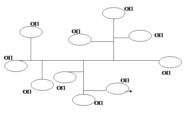 Топология «дерево». Эта структура позволяет объединить несколько сетей, в том числе с различными топологиями или разбить одну большую сеть на ряд подсетей (рис. 4).
