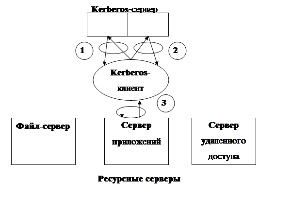 Итак, в системе Kerberos имеются следующие участники: Kerberos-сервер, Kerberos-клиент и ресурсные серверы (рис. 6). Kerberos-клиенты пытаются получить доступ к сетевым ресурсам – файлам, приложением, принтеру и т.д. Этот доступ может быть предоставлен, во-первых, только легальным пользователям, а во-вторых, при наличии у пользователя достаточных полномочий, определяемых службами авторизации соответствующих ресурсных сервер – файловым сервером, сервером приложений, сервером печати. Однако в системе Kerberos ресурсным серверам запрещается «напрямую» принимать запросы от клиентов, им разрешается начинать рассмотрение запроса клиента только тогда, когда на это поступает разрешение от Kerberos-сервера. Таким образом, путь клиента к ресурсу в системе Kerberos состоит из трех этапов: