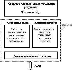 - Средства предоставления собственных ресурсов и услуг в общее пользование - серверная часть ОС (сервер). Эти средства обеспечивают, например, блокировку файлов и записей, что необходимо для их совместного использования; ведение справочников имен сетевых ресурсов; обработку запросов удаленного доступа к собственной файловой системе и базе данных; управление очередями запросов удаленных пользователей к своим периферийным устройствам.
