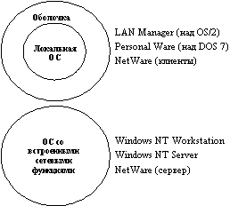 Первые сетевые ОС представляли собой совокупность существующей локальной ОС и надстроенной над ней сетевой оболочки . При этом в локальную ОС встраивался минимум сетевых функций, необходимых для работы сетевой оболочки, которая выполняла основные сетевые функции. Примером такого подхода является использование на каждой машине сети операционной системы MS DOS (у которой начиная с ее третьей версии появились такие встроенные функции, как блокировка файлов и записей, необходимые для совместного доступа к файлам). Принцип построения сетевых ОС в виде сетевой оболочки над локальной ОС используется и в современных ОС, таких, например, как LANtastic или Personal Ware.