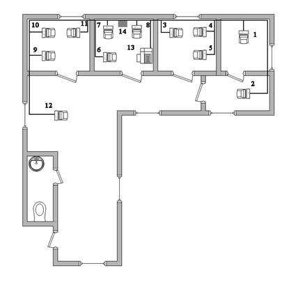 Рисунок 1. Схема первого офиса. 1 – директор; 2 – секретарь; 3, 4, 5 – бухгалтерия; 6, 7 – системный администратор; 8 – электронщик; 9, 10, 11 – дизайнеры; 12 – охрана; 13 – сетевой принтер; 14 – свитч.