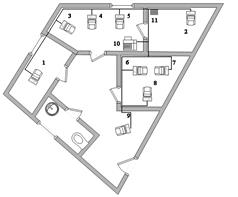 Рисунок 2. Схема второго офиса. 1 – заместитель директора; 2 – фото–студия; 3 – видео оператор; 4 – звукооператор; 5 – сценарист; 6 – маркетолог; 7 – менеджер; 8 – полиграфист; 9 – охрана; 10 – сетевой принтер; 11 – свитч.