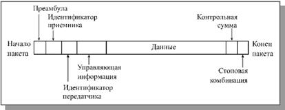 - начальное управляющее поле пакета (или заголовок пакета), то есть поле, включающее в себя стартовую комбинацию, сетевые адреса приемника и передатчика, а также служебную информацию;
