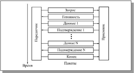 Сеанс обмена начинается с запроса передатчиком готовности приемника принять данные. Для этого используется управляющий пакет "Запрос". Если приемник не готов, он отказывается от сеанса специальным управляющим пакетом. В случае, когда приемник готов, он посылает в ответ управляющий пакет "Готовность". Затем начинается собственно передача данных. При этом на каждый полученный информационный пакет приемник отвечает управляющим пакетом "Подтверждение". В случае, когда пакет данных передан с ошибками, в ответ на него приемник запрашивает повторную передачу. Заканчивается сеанс управляющим пакетом "Конец", которым передатчик сообщает о разрыве связи. Существует множество стандартных протоколов, которые используют как передачу с подтверждением (с гарантированной доставкой пакета), так и передачу без подтверждения (без гарантии доставки пакета).