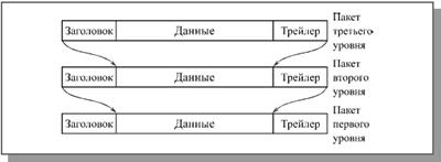 При реальном обмене по сети применяются многоуровневые протоколы, каждый из уровней которых предполагает свою структуру пакета (адресацию, управляющую информацию, формат данных и т.д.). Ведь протоколы высоких уровней имеют дело с такими понятиями, как файл-сервер или приложение, запрашивающее данные у другого приложения, и вполне могут не иметь представления ни о типе аппаратуры сети, ни о методе управления обменом. Все пакеты более высоких уровней последовательно вкладываются в передаваемый пакет, точнее, в поле данных передаваемого пакета (рис. 5). Этот процесс последовательной упаковки данных для передачи называется также инкапсуляцией пакетов.