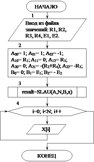 На рис. 3.1 представлена блок-схема программы: блок 1 – считываем из файла данные – R1, R2, R3, R4, E1, E2; блок 2 – формируем матрицу А и вектор свободных членов В; блок 3 – вызов функции SLAU (метод Гаусса); блок 3 – вывод решений – массива х, т.е. значение искомых токов – I.