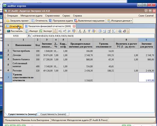 На этапе планирования аудита система позволяет рассчитывать по заданным алгоритмам аудиторский риск и уровень существенности. Рассчитываются также ряд других показателей, таких как денежный поток, ликвидность, платежеспособность, прибыльность и др. Эту задачу выполняет встроенный блок финансового анализа.