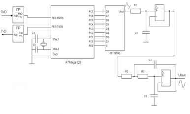 Для реализации генератора сигналов произвольной формы используется блок цифр-аналогового преобразователя, построенного на ИМС DA3 типа TLC5615 фирмы Texas Instruments, что представляет собой десятирозрядний ЦАП с последовательным SPI - интерфейсом, выведенным на порт "B" контролера. Таким образом, употребятся разряды 4-7 порта В. Фильтр исходного сигнала первого порядка организуется с помощью модуля блока исходных ключей, в состав которого входят 2 RC фильтры НЧ для фильтрации исходных сигналов микроконтроллера. Они подключаются к выходам 4-5 порта С.