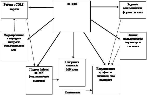Программа пользователя предназначена для выбора и выдачи избранных параметров сигнала произвольной формы, отображение их на экране виртуального генератора и подачи их на объект контроля. С помощью интерфейса пользователь имеет возможность выбирать форму и параметры генерируемых исходных сигналов, задавая форму, амплитуду, сдвиг и другие параметры сигналов, а также масштаб, цвета графика и др.