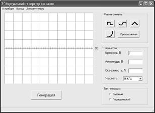 В данном окне программы пользователь имеет возможность выбрать форму генерируемого сигнала, его основные параметры, а также тип генерации.
