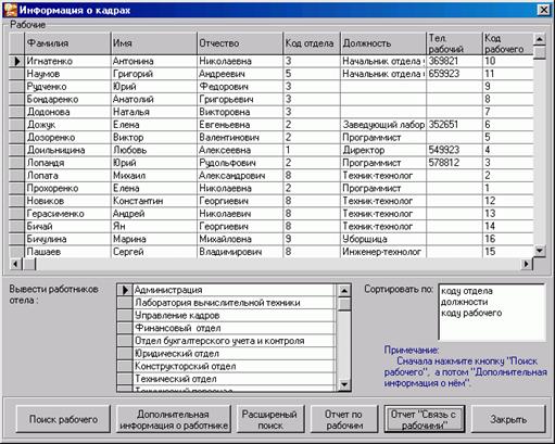 форма с остав (frmSostav) - надає можливість сортування, пошуку та виводу звітів про робітників;