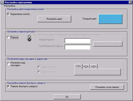 - включати та виключати панель швидкого запуску, змінювати її скін - прапорець “Панель быстрого запуска”, кнопка “Поменять скин панели”.