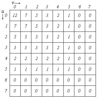 , которым мы располагаем при заданном коэффициенте сжатия и которое нам предстоит распределить между спектральными коэффициентами блока. Исходя из того, что для представления каждого пиксела в блоке исходного черно-белого полутонового изображения требуется один байт, т.е. 8 двоичных единиц, найдем, что для представления всего блока без сжатия расходуется