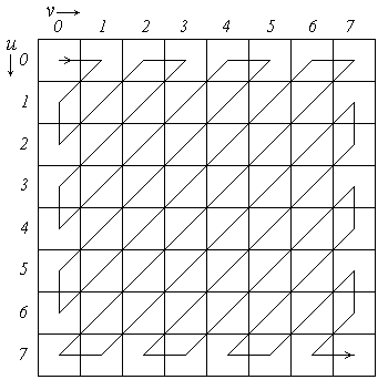 зигзаг-сканирования считываются спектральные коэффициенты с большими амплитудами, а в конце - спектральные коэффициенты, величина которых мала или равна нулю, получающаяся в результате этого сканирования последовательность чисел будет в конце содержать длинные последовательности нулей. Эта особенность используется для дальнейшего сжатия данных путем энтропийного кодирования, которое состоит в последовательном применении метода кодирования длин серий и кода Хаффмена. Из ряда спектральных коэффициентов образуются пары чисел, одно из которых равно значению ненулевого спектрального коэффициента, а другое - количеству предшествующих этому спектральному коэффициенту нулей. Полученные таким образом пары сжимаются посредством применения кода Хаффмена с фиксированной таблицей. В этой таблице наиболее вероятным значениям полученных чисел, которые соответствуют малым последовательностям нулей и малым значениям ненулевых спектральных коэффициентов ставятся в соответствие короткие коды. Поскольку код Хаффмена является префиксным, то в данном случае не требуется разделителей между кодовыми словами.