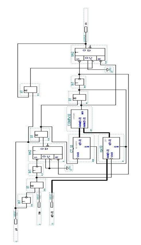 На рис. 3 приведена внутренняя структура цифрового таймера. В начале разработки схемы мы выбрали, как среду разработки MAX+PLUS II. Запустив пакет САПР AlteraMax + PLUSII, в графическом редакторе Graphic Editor, мы создали новый файл(file, new…), выбрали из базы данных нужные нам элементы. С помощью редактора MegaWizardPlug-InManager, встроенного в Max+ PLUSII, были сделаны десятиразрядные регистр, счётчик и компаратор.