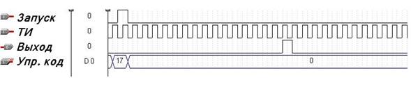 На рисунке 4 приведён результат моделирования работы таймера. Для примера на устройство был подан код числа 17. Как видно из графика, управляющий код записывается по фронту импульса «запуск» и спустя 17 тактовых импульсов после запуска, схема выдаёт импульс длительностью 5*10-7 с.