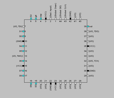 Ядром цифрового таймера в данном проекте является программируемая логическая интегральная схема фирмы ALTERA. На рис. 5 приведено расположение выводов для ПЛИС, использованной в данном проекте. На рис 6 изображена уже запрограммированная для данного проекта ПЛИС и указаны её выводы.