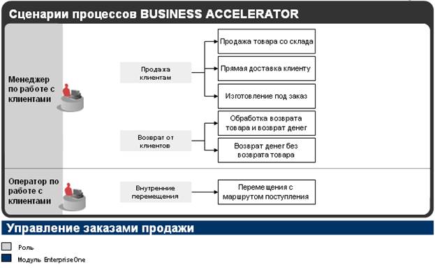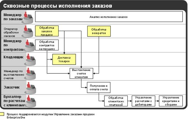 В типичной компании, использующей Oracle JD Edwards EnterpriseOne, сотрудникам приходится заниматься различными видами деятельности. Их разносторонние должностные обязанности требуют понимания взаимосвязи всего спектра бизнес-процессов, происходящих в компании. Один и тот же менеджер, например, может назначать цену, принимать заказ, проверять историю отношений с клиентом, обновлять прогнозы продаж и подписывать счета к оплате.